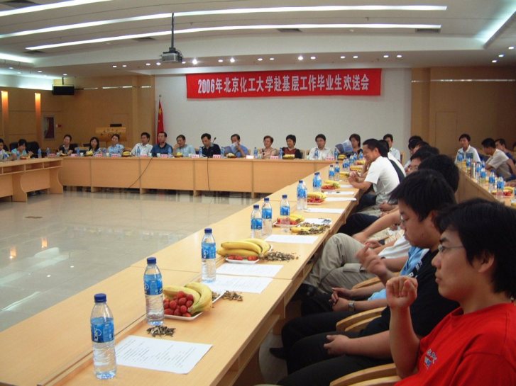 7月2日下午3:30,北京化工大学2006年赴基层工作毕业生欢送会于图书馆一层多功能厅隆重召开。校党委副书记兼副校长任新钢、学工办主任赵恩平、北区办主任崔文勇、生命学院党总支书记张丽叶、学工办副主任任世雄、北区办副主任石冰洁、各学院总支副书记、参加红色“1+1”支部书记、我校担任首都村党支部书记助理、村委会主任助理毕业生、参加“西部计划”毕业生、参加“北京基层计划”毕业生出席了本次欢送会。会议由校学工办主任赵恩平主持。