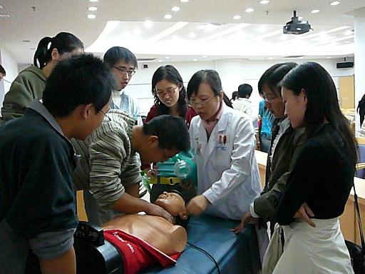 理论培训从《2005年国际心肺复苏指南》开始,由中日友好医院急诊室的曾主任简要介绍了国内外公共场合急救设施的普及情况、心肺复苏的手式及注意事项。通过图片展示和病症描述,具体讲解了心肺复苏的“A-B-C-D”四步骤,即开放气道、吹气、胸外按压、除颤。在互动培训阶段,同学们在急诊室孙叶护士长的指导下,学习在人体模型上寻找按压部位,通过显示设备,大体掌握了按压的力度和方法。另外在急诊室林主任和护士的指导下、现场同学的配合下,同学们进行了心肺复苏急救演习训练,在一次次错误的纠正中,大家熟悉了急救实施的具体步骤,对急救知识有了基本的掌握。更有一名材料学院的同学自愿当起了真人模型,以便同学们能有更加深刻的认识。整个培训过程中,志愿者认真学习急救知识,积极参与动手实践,表现出了极大的热情。会后,中日友好医院的医生表示,在2008年奥运会志愿者系列培训中,一定还会来我校为同学们教授更细致的急救知识。