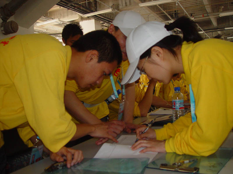 下午一点四十分,满怀**的志愿者们到达了工人体育场。经过18号的成功演练,每位志愿者都十分熟悉自己的工作岗位和工作职责,在第一时间奔赴自己的岗位,为比赛正式开始做好充分的准备。运行支持小组将饮用水、扩音器等每天必需的岗位物资提前到岗,保证各部门职能的正常运行;员工行政部门制定了完整周密的轮岗轮班制度,保证人流量增大等紧急情况的人员调配和志愿者用餐、休息等。五点三十分,工人体育场正式开门迎客,志愿者们面带微笑有条不紊的工作着。票检处的志愿者认真验票,引导员志愿者耐心地为每位观众指示如何进入指定看台区。坐席服务区的志愿者任务更艰巨,观众询问比赛何时开始,如何购买餐饮等等问题,他们都一一耐心解答。观众信息服务亭的志愿者们微笑解答每一位咨询投诉的观众,用耐心诠释志愿者的热情。承担吉祥物扮演任务的志愿者们在比赛开始和结束后穿着福娃造型的服装,背着十斤左右的鼓风机,平日5分钟的路程却需要一个小时,只因为观众的热情合影。工人体育场到处都可以看到志愿者们忙碌的身影。