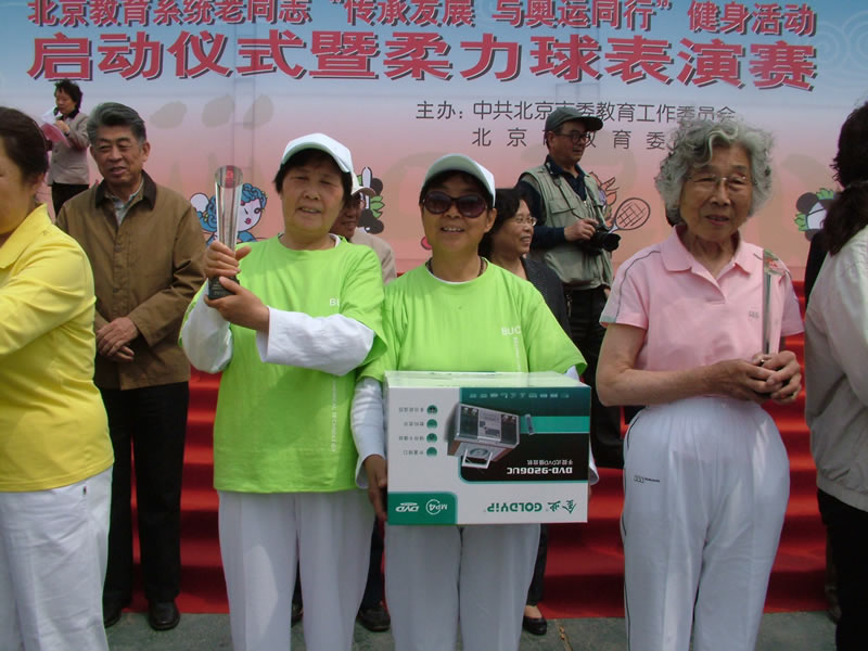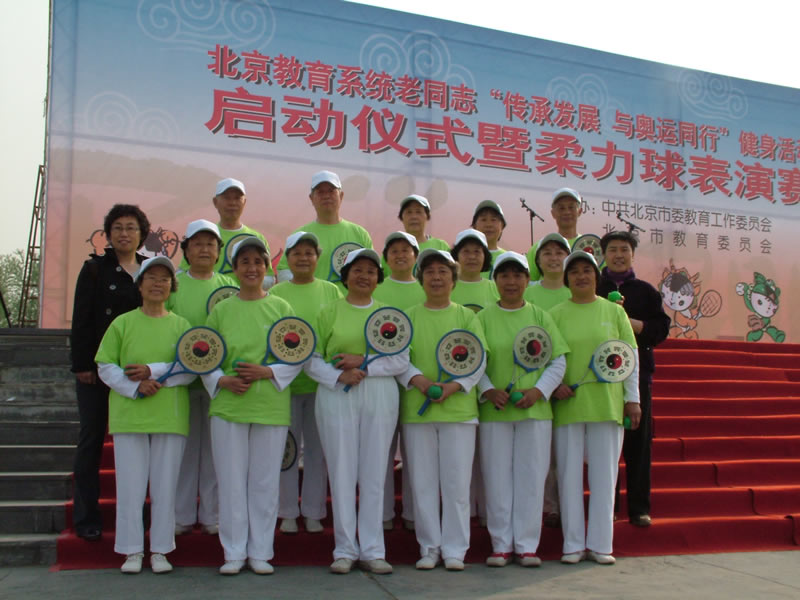 2008年4月18日阳光明媚,晴空万里。我校40余位老同志在李二英处长带领下,喜气洋洋地来到北京海淀公园文化广场参加中共北京市委教育工作委员会、北京市教育委员会在此举办的“传承发展,与奥运同行”健身运动启动仪式暨柔力球表演赛。市委教育工委副书记刘建、市老干部局局长高力、市教委委员吴松元、市教委老干部局政治待遇处的领导出席启动仪式,来自北京区县教育系统、在京高校的千余名老同志参加了此项活动。