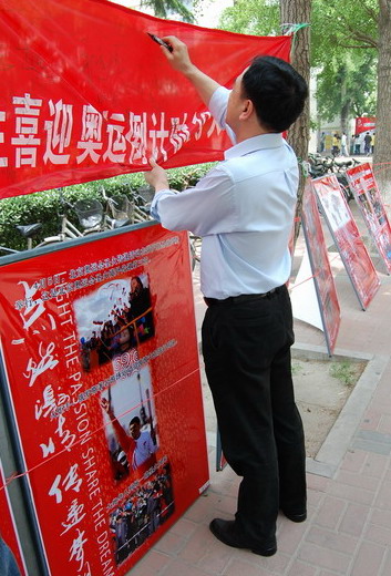中午十一点,签名活动在图书馆西侧正式拉开帷幕。理学院制作十五张奥运圣火传递展板,记录了奥运圣火在世界各地传递的全过程,向全校师生展示了全中国人民企盼奥运、关注奥运的爱国热情。从希腊雅典的圣火采集到法国巴黎金晶勇护圣火的爱国举动,每一个画面、每一个片段都流露出中华儿女对奥运的渴望与期待。在学生会同学的大力宣传下,过路的同学们纷纷停下脚步将自己的名字签在条幅上。校党委副书记兼副校长任新钢老师也亲临现场,欣然在条幅上签名,并对我们迎奥运签名活动给予肯定与支持,希望同学们理**国,努力学习,以实际行动为奥运、为祖国做贡献。理学院学生工作负责人于景华老师也积极参与其中,表达了他们对北京奥运成功举办的美好祝愿。