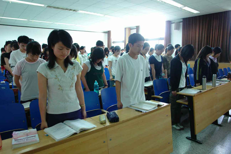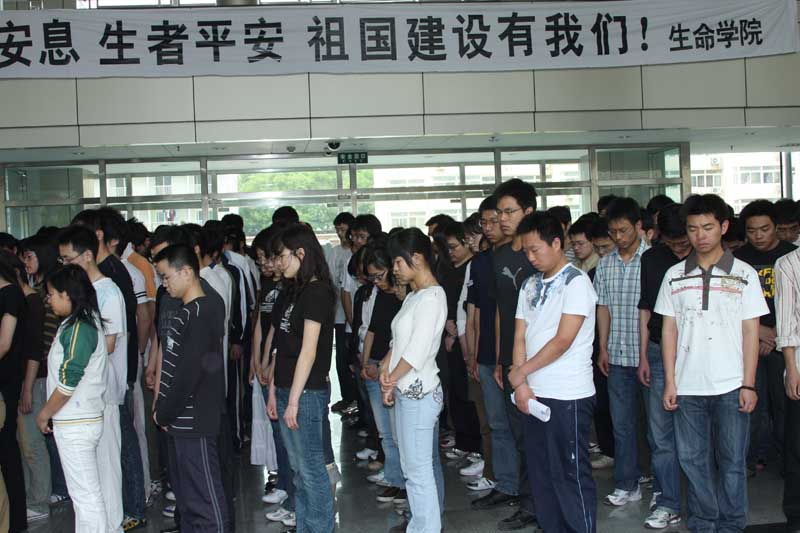 我校全体师生在校园内静静默哀,这一刻,让我们共同为罹难者默哀,永远铭记这一惨痛的经历。广大学生着素装聚集在篮球场,系上黄丝带为罹难者默哀。教学楼内正在上课的师生们暂停了上课,科技大厦、图书馆内的师生们也放下了课本,全体起立默哀。我校各机关部处在各自工作地放下工作,就地起立默哀。在校园内行走的师生们,也停住了脚步静静默哀。同一时刻,只有校园外汽车鸣笛声,整个校园沉浸在沉沉的哀痛中。