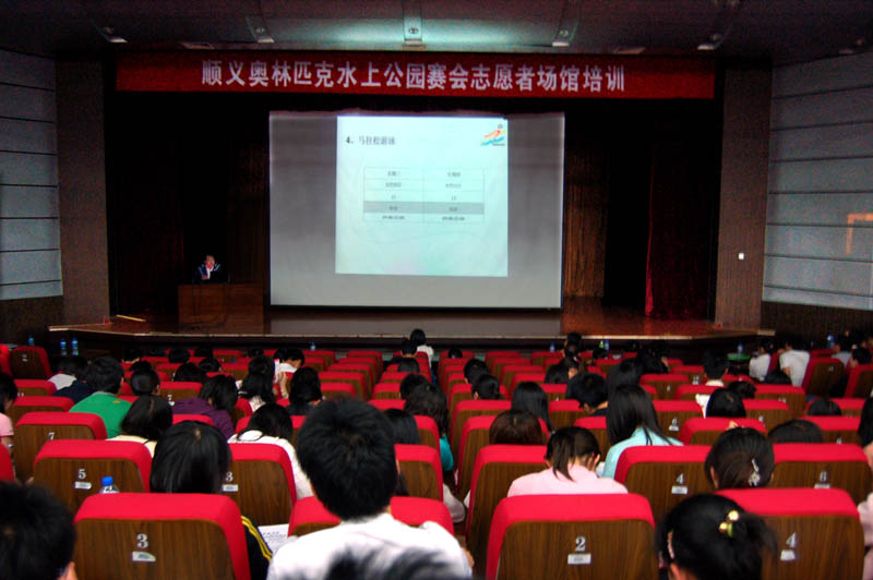 2008年5月18日,551名顺义奥林匹克水上公园赛会志愿者齐聚北京化工大学科学会堂,参加了“顺义奥林匹克水上公园赛会志愿者场馆培训”。这551名志愿者分别来自化工大学、对外经贸大学、北京外国语大学、北京第二外国语学院和现代学院。此次培训由顺义场馆副主任苏华带队,九位场馆部门经理为讲师,他们为志愿者做了专业的培训。