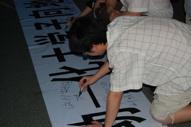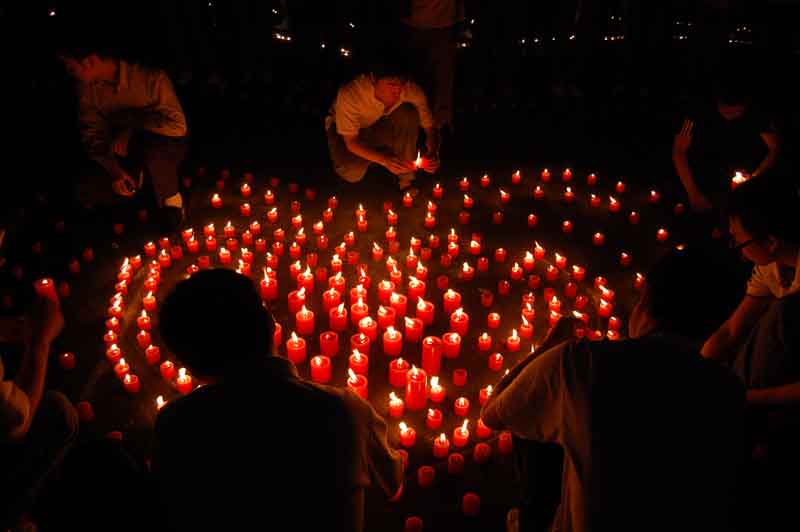 同学们在“祈福汶川,奉献奥运”的横幅上签上了自己的名字,表达了对灾区人民的祝福和对北京成功举办奥运会的决心;他们在鼓励墙上按下手掌印,鼓励灾区人民重建家园、树立信心。三千余名师生手捧蜡烛围成“心”型,面对四川方向,深情诵读祈福词《天佑中华》,为遇难的同胞们深情祈福,亲手叠成的千纸鹤捎去了化大学子深深的祝福。研究生宿舍楼的灯光分别组合成“汶川”、“化大”、心形图案、中国印、“加油”等图案,与每次的精彩展示不同的是,同学们没有欢呼,有的只是双手合拳、默默的祈祷和祝福。