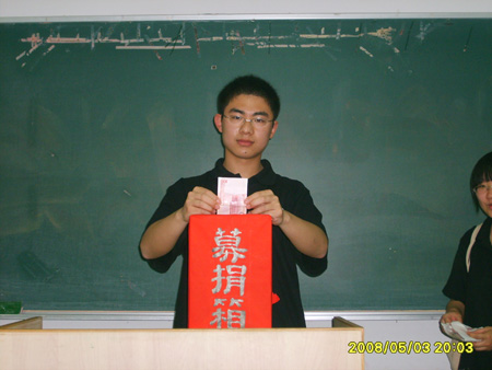 “一方有难,八方相助,为地震灾区尽微薄之力”,在地震发生后第二天,经管学院团总支学生会就向全院学生发出了倡议,立刻得到了广大同学的高度关注和支持。许多同学捐出了自己的生活费,有的同学捐出了自己在外**赚来的钱;还有许多来自贫困地区的同学,虽然自己的经济条件也不够好,但也热情地为灾区人民献出了自己的一片爱心,他们说,灾区人民现在所遭受的苦难比他们所承受的经济上的困难要苦的多;还有今年刚刚获得了国家奖学金的一位同学将8000元奖学金全部捐出;同样来自灾区的同学,主动放弃学校学院的资助而给受灾更严重的同学……感人的事情,感人的话语,让我们每天都在感动。