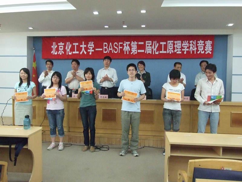 2008年5月28日下午,“北京化工大学-BASF杯第二届化工原理学科竞赛”颁奖仪式在我校逸夫图书馆中心会议室隆重举行。我校副校长付志峰、巴斯夫(中国)有限公司科技合作部经理马莲、教务处副处长白守礼、化工学院分党委书记屈一新、化工学院副院长李建伟、国家名师奖获得者杨祖荣教授出席了颁奖仪式。颁奖仪式由李建伟副院长主持。