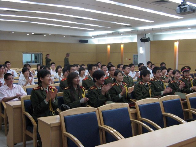 2008年6月16日晚,我校国旗护卫队04级队员离校暨07级队员入队仪式在图书馆多功能厅隆重举行。学生工作办公室副主任、武装部部长王小健老师、校团委书记董振兴老师、机电学院党总支副书记于洪杰老师、国旗护卫队顾问燕明星老师出席了此次仪式。国旗护卫队2004至2007级四届共120名队员,及03级已经毕业的老队员济济一堂。此外,刚刚成立不久的北方学院国旗护卫队代表在政委武玉亮同学、队长王腾同学的带领下参加了此次仪式。