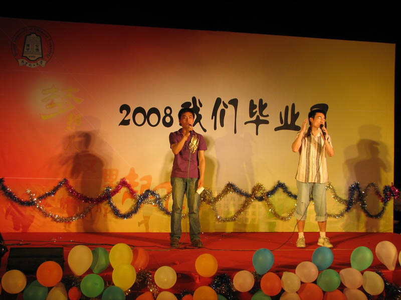 “感恩的心”为毕业生们提供一个平台,敞开自己的心扉表达对学校、老师、同学们的爱与祝福,在精美的卡片上他们留下了各种祝福:有的表达了对母校的祝福,值此校庆50周年之际,希望母校能够建设的越来越好;有的祝福老师们和同学们,感谢老师们对自己的辛勤栽培,珍惜自己与导师之间建立的深厚感情,希望同学们都能够找到一份不错的工作,希望师弟师妹们能够再出好成绩;也有的祝福在地震中受灾的群众们早日重建家园等等。展板上承载着大家太多太多的祝福,却远远不能诉尽毕业生们对母校的恩情与祝福;“**的梦想”活动在轻松愉快的氛围中,优秀师兄师姐代表与在校研究生共同分享了他们研究生生涯在中学习生活、职业生涯规划、人生目标选择等方面的心得和体会,他们把宝贵的经验和优良的传统传递给我们,为同学们的求职之路点亮了一盏明灯,为今后的成才、进步、报效祖国指明了方向;“五彩的青春”活动将久别的户外电影带入了校园,用这种方式来表达对即将离开校园的师姐师兄们的祝福,希望他们在新的岗位上做出新的贡献,也希望他们能够常回母校看看;6月6日晚七时,欢送2008届毕业生大型文艺晚会在东篮球场拉开帷幕,今年晚会的主题是“色彩青春,斑斓未来”,共分为五个环节,与奥运五环颜色有关,更是体现了学校生活的不同阶段。红色代表**,绿色象征青春,黑色寓意求索,黄色表示收获,蓝色表达无限的畅想;大家以歌舞游戏多种方式表达了对学校生活的依恋,对美好生活的向往;“跳动的真情”即将离校的毕业生把自己珍贵的学习和生活用品用低廉的价格交给师弟师妹们使用,不但加强了感情的交流,同时也使得勤奋,节约的精神一代代在化大学子中相传下去,积极搭建起了师兄师姐和师弟师妹们友谊的桥梁。