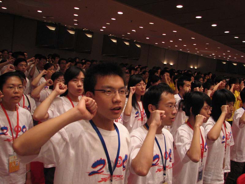 誓师大会在庄严的国歌声中开始,来自安保运行团队、设施环卫团队、餐饮团队、志愿者团队的代表先后上台发言、领誓,表达了作为一名奥运服务人员的荣幸、信心和决心。随后我校曾羽洁同学代表北京化工大学和对外经济贸易大学住宿服务团队所有成员发言,表示要立足岗位、热情服务、不辱使命、迎接挑战;要以饱满的工作热情,弘扬中华精神、奉献智慧微笑,力争为办好有特色、高水平奥运会而贡献自己全部力量。两校学生“金牌服务,荣我中华;精彩汇园,无悔零八!”的口号响彻整个会场,回荡在每个人的心中。