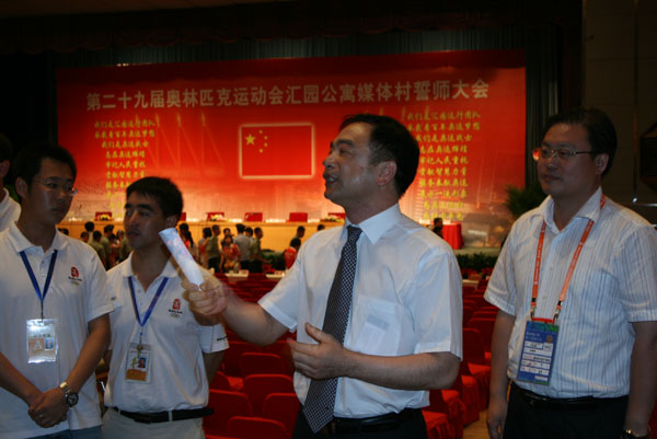 会前,由奥组委新闻宣传部部长王慧做媒体专项培训,并从如何看待我们的服务对象——外国记者,并以什么态度来工作,做了具体讲解。她指出在新形势下所有媒体村工作人员都应以树立中国形象为己任,以微笑面对所有记者,以最大的热情投入到自己的工作中去,我们应勇于接受挑战,展示中华民族的风采。