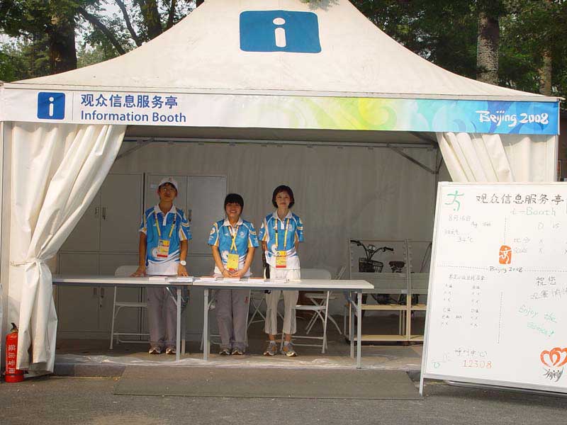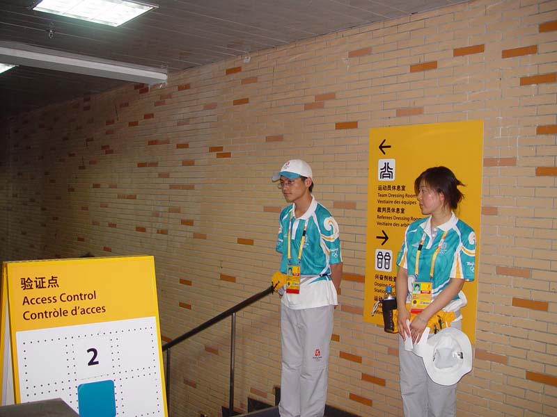 岗前动员会后,志愿者们立即投入到各自的岗位中去。场馆团队组织开展了针对志愿者语言、站姿等的岗位演练,并进行了情景模拟训练。同时,为加强各岗位志愿者工作的整体配合与衔接,所有志愿者参与了全场综合演练。福娃表演、餐饮售卖点、信息亭等岗位全部模拟使用;信息亭与语言服务紧密配合,以应对赛时各国观众的信息需要;在观众服务业务口的验证点、坐席服务岗等岗位,志愿者顺利地解决了模拟突发事件,态度良好、处理得当。此外,场馆还模拟演习了赛事进行中的雷雨突降事件处理、特殊客户群服务等场景,以便全面地掌握赛事需求。为增加此次模拟赛事场景的真实性,场馆团队专门请来了北京宏登足球俱乐部与北京理工大学现场对阵,在实战中摸索赛会服务对志愿者工作的实际需求。