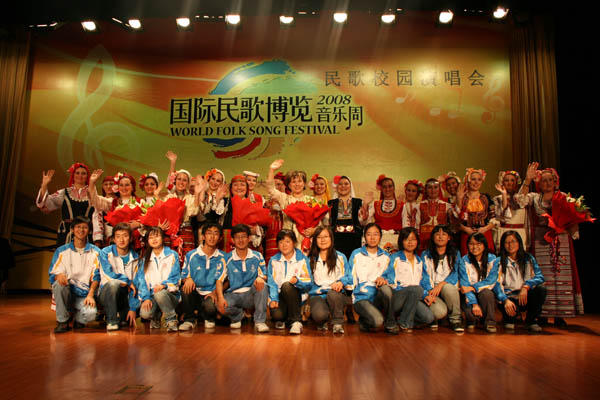 晚7:30,国际民歌演唱会拉开了帷幕。融合了浓浓民族风情兼具了中外两种文化魅力的演唱会由风格鲜明的两大部分构成,来自青海省的音乐家们将悠远动听的青海花儿、热情奔放的伊舞和深情的情歌对唱场景相融合,他们亮嗓舞袖的美丽瞬间将观众们带到了一望无垠飘扬着天籁般原生态音乐的大草原。来自保加利亚合唱团的18位艺术家和她们的指挥娴熟默契的配合如一架世界顶级的手风琴,在微笑之间将动静交替、舒缓活泼兼有的音乐之风徐徐的吹到观众的心间,使每一位聆听者都被跨越语言和国界的音乐所感动和震撼。沉浸在音乐海洋中观众在每一曲结束时都对艺术家们精彩的表演报以雷鸣般的掌声。在演出结束之后,我校奥运志愿者代表走上舞台为来自远方的艺术家们献上鲜花,对他们的精彩表演表示感谢,同时与远方的客人合影留念。