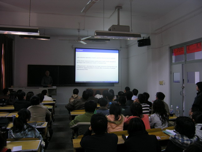 10月27日下午,教学楼417座无虚席,来自法国南希大学Jean-Pierrre Corriou's教授给信息学院控制专业师生带来了一场关于工业气相聚合反应器的多变量控制(Multivariable control of an industrial gas phase copolymerization reactor)的讲座。信息学院院长朱群雄教授、副院长靳其兵教授、自动化系主任曹柳林教授、楚纪正教授、李宏光教授、黄克谨教授以及研究生近百余人聆听了讲座。