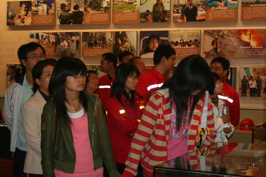 在5.12抗震救灾中,作为人民公仆的中国共产党充分展现了其政治领导核心和先锋模范作用。随着在碎石瓦砾间奔走的***、废墟上高举党旗郑重宣誓入党的抗震救灾人员和不顾生命危险毅然冲入废墟的抗震救灾志愿者等感人至深的画面映入眼帘,感动与沸腾的热血在每一个参观人员的身上蔓延开来。一组组的图片带来了内心持久的震撼,同时也让大家深刻地体会到作为一名党员应该肩负起的重担。作为党员他们为了抢救国家财产失去了抢救亲人的机会,在经历了失去亲人的痛苦之后,却仍然坚守在自己的岗位上;作为党员他们无数次在危险中穿梭,只是为了寻找那些废墟下依然跳动的生命;作为党员他们将自己的一切献给了抗震救灾事业,只是为了灾区能够早日重建。在任何大灾大难面前,党员像一面旗帜一样,永远走在人民的前面,勇于牺牲,用行动实践着全心全意为人民服务的宗旨。参观过程中同学们还在留言簿上留下了自己的感言,表达了自己心底的真诚的感动、对中国共产党的敬意和对祖国美好明天的祝愿。