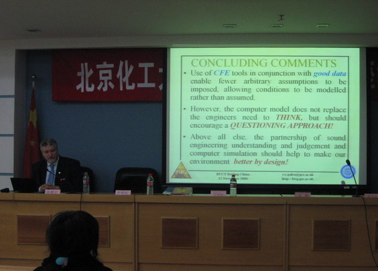 之后,Ed Galea教授为我校师生作了题为“Computational Fire Engineering: The computer simulation of fire and evacuation”的学术报告。Ed Galea教授以发生在世界不同地区的火灾案例展开详尽的论述,在面对突如其来的灾难时,人们通常是比较紧张的,但是如何以一种理性、科学的手段尽快地逃生呢?Ed Galea教授用数字化模拟的技术向我们逐一展示。在不同的场所遇到火灾,应有不同的应对措施,这就对我们的安全管理提出了很高的要求,当建造某一项建筑的时候,逃生通道的设立必须考虑放在很重要的地位。通过模型演示,同学们清晰地了解了火灾发生后的蔓延趋势,同时,Ed Galea教授还讲述了中西方文化的差异所导致的火灾逃生差异。在最后,Ed Galea教授不无幽默地用中国传统智慧“三十六计走为上策”为今天的讲座画上了一个圆满的句号。同时,Ed Galea教授热情洋溢地回答了在座同学的提问。