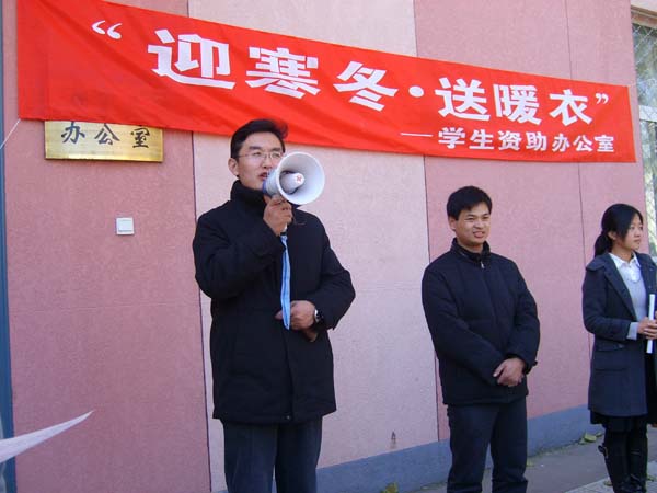 2008年11月21日,学生资助办公室在北校区开展了“迎寒冬、送暖衣”活动,为我校大一年级家庭经济困难学生发放了400余件保暖内衣。在寒冬即将来临之际,解决了贫困生缺少过冬衣物的实际困难。北区办副主任庞然,08级全体辅导员出席了此次暖衣发放活动。