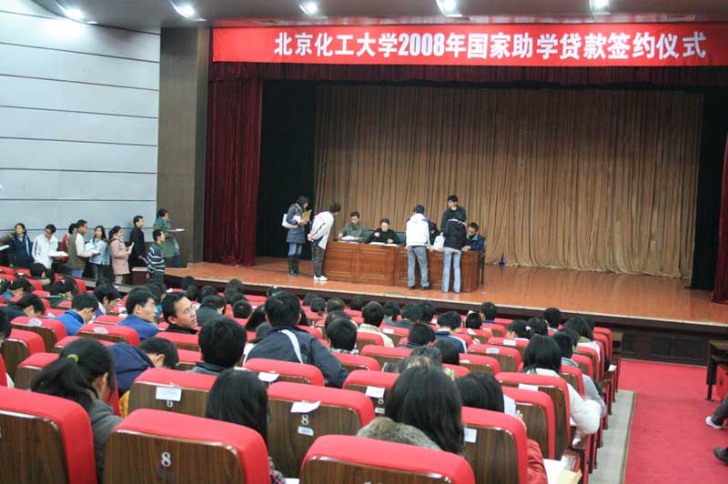 2008年11月23日上午,我校2008年国家助学贷款签约仪式在东、北两校区同时举行,校学生资助办公室主任王小健、副主任黄晓一以及中国银行北京分行信贷部、中国银行樱花东街支行的领导出席了此次签约仪式。包括高职、本科和研究生在内的共1086名家庭经济困难学生参加了此次仪式并与中国银行樱花东街支行工作人员现场签订了国家助学贷款合同和放款手续。