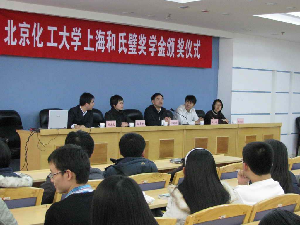 2008年12月29日下午两点,北京化工大学上海和氏璧奖学金颁奖仪式在图书馆中心会议室隆重举行。我校党委副书记兼副校长任新钢老师、上海和氏璧化工有限公司北京办事处经理尹鹏先生、市场部经理刘科英女士、学生工作办公室副主任邹立娜老师出席会议,会议由化学工程学院党委副书记商云龙老师主持。