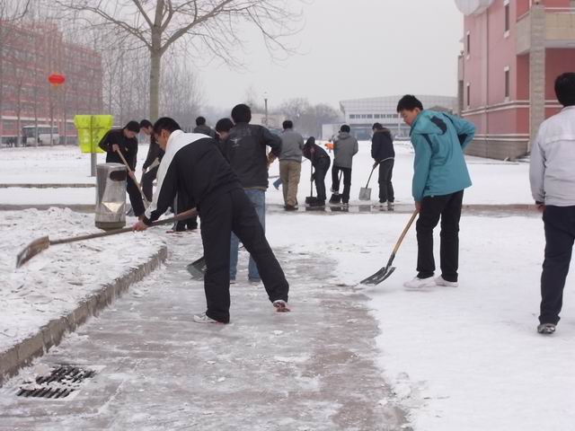 金牛初春,瑞雪盈门。新学期伊始北京连续两天飘雪,北校区粉色的楼群在银装素裹间显得分外妖娆。2月18至20日北区二百多名学生在北区办以及全体辅导员老师的带领下共同扫雪铲冰,在教学楼、宿舍、食堂、校门之间开辟出条条大道,解决了路面湿滑的问题,为广**生提供了出行方便。虽然初春的雪带来了降温,但是师生共同与积雪奋战的热火朝天,不仅身上热出了汗,而且也让整个校园充满了和谐与温暖!