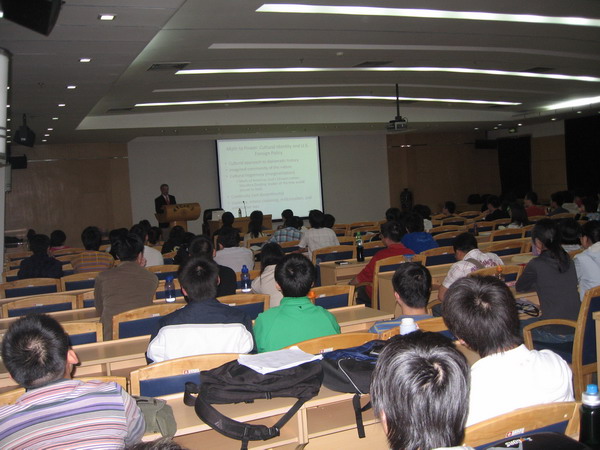 4月13日,外交学院富布赖特客座教师Walter Hixson 教授应邀,来我校作了关于美国对外政策的解析讲座,受到了广**生的欢迎和好评。讲座由文法学院刘杰教授主持,大约有60多名师生参加。讲座内容深刻而充分,形象易懂。前一个小时由Walter Hixson 教授简要讲解了美国历史上的主要战争,战事及事件,突出分析了美外交政策的历史渊源与观点,启示了在全球化的今天,美国应改变其传统的选择战争的对外政策。在全球经济危机的当前,应更多地寻求经济政治上国际与地区间的合作,以共渡难关。在讲座的后一个小时大家踊跃提问有关中美关系及当前全球政治经济问题,形成了良好的互动。美教授对此有很高的评价并特别赞赏我校师生所提问题比他所去到的外交外语类院校的同学所提问题更加透彻深刻,表现出了我校师生的政治理论水平及对当前政经及中美关系有较深切的关注。通过这次讲座师生们对美新政府的对外政策及中美关系有更多的启迪和领会,将推动对其进一步的探讨思索,受益非浅。讲座丰富充实了师生们的对外文化交流,满足对多方面知识的需求和涉猎,开阔了视野。这也是我校开展对外文化交流的重要举措之一。 (国际处、文法学院 供稿)