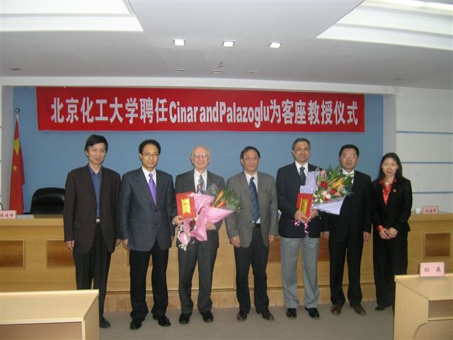 化工学院院长陈建峰教授首先向大家介绍了Cinar教授和Palazoglu教授的履历和研究成果,副校长陈标华教授代表我校为Cinar教授及Palazoglu教授颁发客座教授聘书并赠送了礼物,学生代表向Cinar教授和Palazoglu教授献花并佩戴校徽。