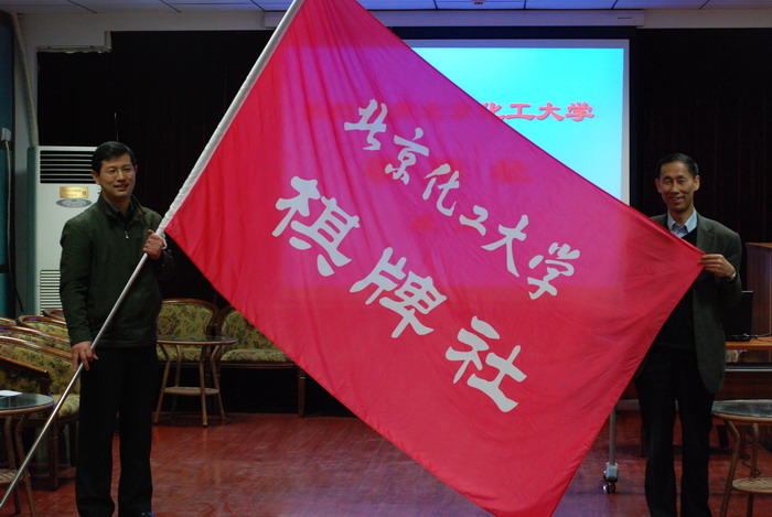 随后校党委副书记兼校工会主席、棋牌社名誉社长王同奇向张明德老师颁授了棋牌社会旗,对棋牌社的成立表示热烈祝贺,希望棋牌社有计划地组织各类棋牌活动,有力促进广大教职工的相互交流和身心健康,并积极促进大家本职工作的开展。
