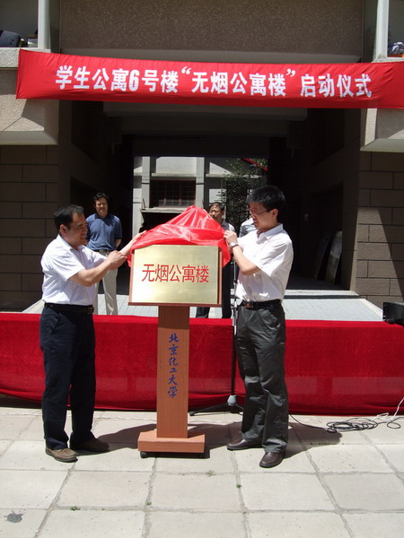 许利民老师指出学校高度重视学生公寓6号楼的防火安全建设,自学习实践科学发展观以来,学校组织后勤服务集团、保卫处、研究生院、学生工作办公室、国有资产管理处和各学院主管领导共同组建了6号楼防火安全工作领导小组,并于4月20日出台了《北京化工大学学生公寓6号楼防火安全管理规定》、《无烟公寓楼管理措施》和《宿舍安全责任书》等相关配套规定及文件,以“社区文化节”的品牌活动为平台,开展了众多6号楼宿舍文明、宿舍文化活动。赵恩平老师在讲话中指出,戒烟活动不仅仅是学生公寓6号楼的规定,是学生爱惜自己和他人生命和财产安全的要求,更是当代大学生文明素质和社会责任的具体体现,希望同学们配合防火安全工作领导小组的工作,积极参与无烟健康文明宿舍楼活动。6号楼公寓自管委杨威同学向全校同学发出倡议,号召大家珍爱生命,远离烟草。郭亚臣副处长和贾涛副主任共同为“无烟公寓楼”揭牌,吴君华经理郑重宣布6号公寓“无烟楼”从即日起正式启动。