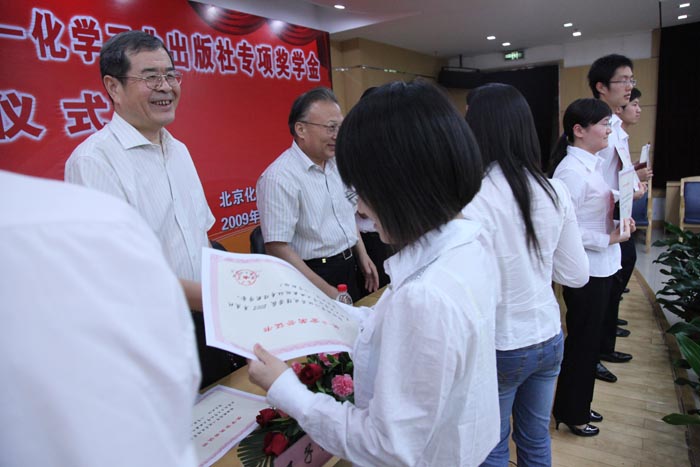 6月9日下午,2009年“北京化工大学——化学工业出版社”专项奖学金颁奖仪式在图书馆多功能厅隆重举行。化学工业出版社社长俸培宗、党委书记兼副社长张宛如、副社长兼党委副书记周伟斌、副社长兼党委副书记刘海星、副社长兼总编辑潘正安、社长办公室主任王婳,北京化工大学校长王子镐、副校长王贵、党委副书记兼副校长任新钢、副校长付志峰、副校长谭天伟以及双方相关部处领导出席了此次颁奖仪式。仪式由学生工作办公室主任罗伟主持。