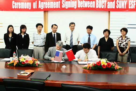6月8日,北京化工大学与纽约州立大学环境科学与林业科学学院(SUNY-ESF)本科生联合培养签字仪式在逸夫楼会议中心举行。参加本次签字仪式的领导有北京化工大学王子镐校长,谭天伟副校长,纽约州立大学环境科学与林业科学学院副校长Bruce C. Bongarten博士,和Liu Shijie博士。参加本次签字仪式的还有国际处耿海平处长,教务处姜广峰处长,生命学院全体院领导和部分教师参加了本次签字仪式。