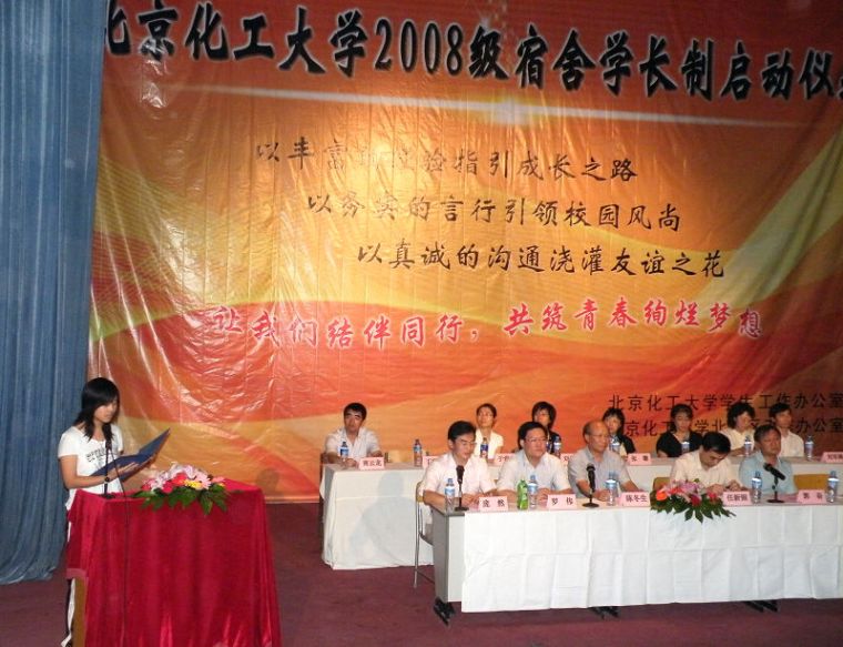 2009年6月24日下午三点半,北京化工大学2008级宿舍学长制启动仪式在北校区多功能厅隆重举行。北京化工大学党委副书记兼副校长任新钢、副校长陈冬生、北区办主任郭奋、学生工作办公室主任罗伟,各学院负责学生工作的领导以及08、09级全体辅导员出席了此次启动仪式。会议由北区办副主任庞然老师主持。