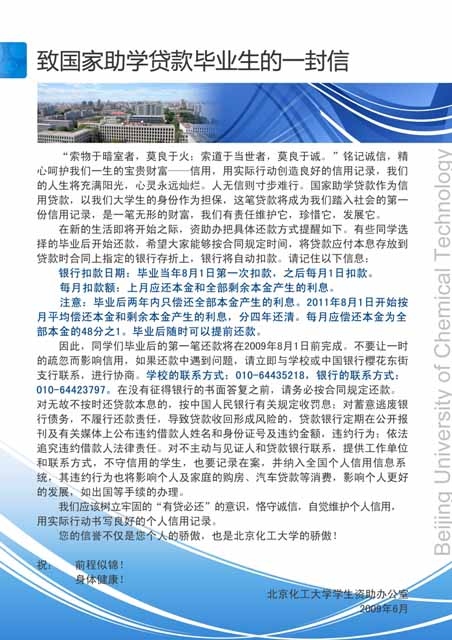 也许,家境困难曾经让父母含辛茹苦,曾经让你迷茫无助。我们都不会忘记,社会和学校对经济困难学生的关爱如春风化雨,伴随着各项资助政策,在你的努力奋斗下,在父母的叮咛中,在学校和老师同学的关爱下,大学生活必将使你终生难忘。尤其是国家助学贷款政策的实施,学费和生活费不再是你的困扰,它帮助你圆满完成了学业,成为北京化工大学一名优秀的毕业生,成为了社会的栋梁之才。