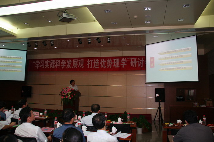 7月10日,理学院召开“学习实践科学发展观 打造优势理学”研讨会。校党委书记王芳,党委副书记兼副校长任新刚,党委副书记王同奇,副校长付志峰、陈标华、谭天伟、李显杨、关昌峰,中科院院士段雪教授出席了会议,会议由理学院分党委书记白守礼主持,理学院全体教职工参加了会议。