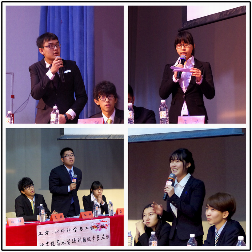 本次决赛由2004级校辩论队主力辩手、团中央“心灵阳光”杯北京市大学生辩论联赛冠军刘竞超,国务院机关事务管理局财务管理、2005级校辩论队主力辩手尹建栋,2013级清华大学医学院生物医学工程博士、2010级校辩论队领队郑硕担任评委。比赛中,正方材料学院先发人,针对北京缺水的现状提出政府和人民应该共同承担责任,但是比较更应该靠哪一方要根据可行性和有效性进行论证。正方分别从工业、农业以及生活用水为出发点,有力地论证了政府用行政手段进行宏观调控可以促进技术革新,从而更好地提高水资源利用效率。反方机电学院毫不示弱,据理力争,提出应充分发挥市场的决定性作用,简政放权,同时通过人民的节水行为倒逼企业进行改革。在随后的攻辩环节和自由辩环节中,双方更是步步紧逼,争锋相对,以敏捷的思维,犀利的言辞,为观众奉上了一场精彩绝伦的逻辑突围。辩手们舌灿莲花,字字珠玑,在辩论场上一展风姿,增添了比赛热烈氛围的同时体现我校青年学生们良好的精神风貌。在最后的总结陈词环节中,双方辩手沉着应对,寓理于辩,以严密的逻辑和令人耳目一新的价值升华征服了在场的每一位观众。最终,由反方机电工程学院摘得桂冠。