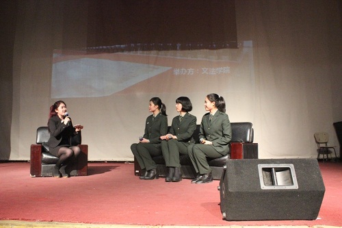 文法学院退伍三军仪仗女兵曹洋结合自己的参军报国经历,为同学们声情并茂的讲述了为参加“9.3”阅兵所进行的超乎想象的艰苦训练与磨砺,为现场同学带来了极大的震撼与感动。曹洋说:“当我们身穿军装走过天安门广场,激动地热泪盈眶,那份民族的自豪感无以言表,那一刻,自己深深地意识到国强才能有安稳的生活。训练当然辛苦,但是比起最后能为国争光,所有的汗水都值得。退伍回到学校,我们依然可以为了国家的强大,尽自己的绵薄之力。” 广西籍女兵欧海梅结合自己参加俄罗斯军乐节的光荣经历,分享了在他国受到赞美的骄傲与自豪。新疆籍女兵贾梦结合自己艰苦训练和受国家领导人检阅的荣耀,分享了有志青年就是要参军报国,为国争光的使命与担当。