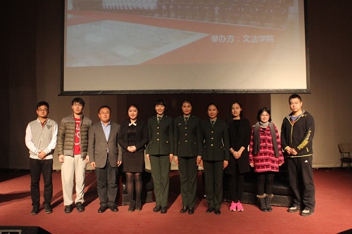 为进一步纪念中国人民抗日战争胜利70周年,弘扬民族精神,培育和践行社会主义核心价值观,进一步提升同学们的爱党爱国热情,11月14日下午,文法学院邀请三位曾服役于三军仪仗队的女兵于北功厅举办先进事迹报告会。其中我校文法学院2012级曹洋同学曾光荣得参加了今年在天安门广场隆重举行的纪念中国人民抗日战争暨世界反***战争胜利70周年大阅兵活动。文法学院党委副书记李富家,文法学院北区辅导员和全院新生参加了此次活动。