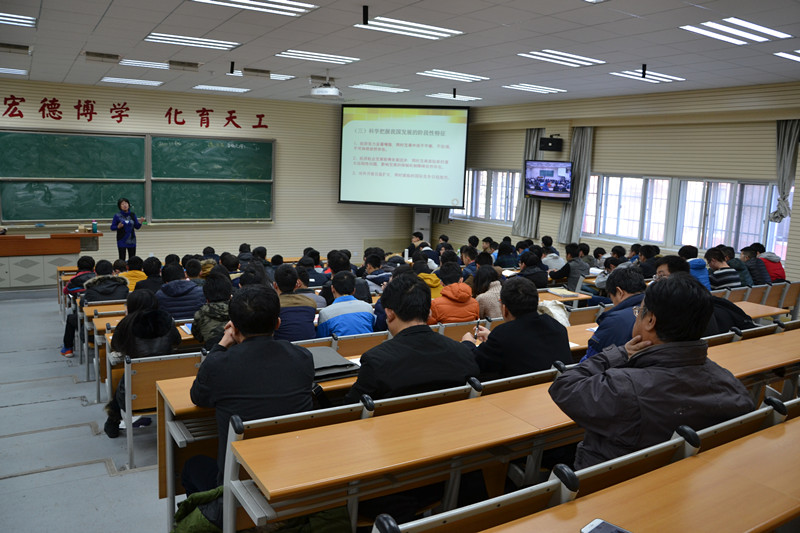 谭天伟校长一行先来到北区实验楼,现场查看了化学实验室和物理实验室的上课情况,并与化学实验教师进行了亲切交谈。谭天伟校长鼓励实验室任课教师积极参与萌芽杯活动,成为学生的课题导师并给予相关指导;同时,他也希望实验室要尽最大努力为大学生的创新性实验提供更多更好的支持,在加大实验室对学生的开放程度的同时,多方位提高学生的整体培养质量。随后,一行人员随机听取了一节毛泽东思想概论课程。
