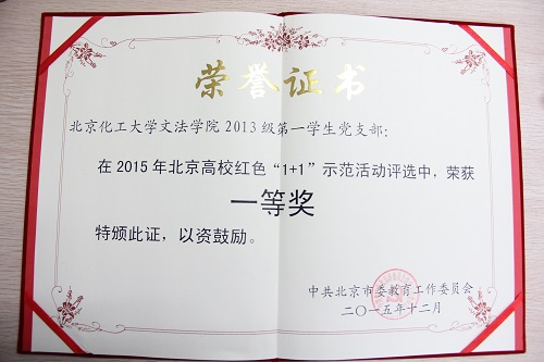 12月8日,2015年北京高校红色“1+1”示范活动展示评选会在北京林业大学举行,共有来自首都各高校的25个学生党支部参与角逐,经过视频展示和现场答辩等环节,我校文法学院2013级本科生第一党支部从与众多会学生党支部中脱颖而出,最终以优异的成绩荣获一等奖。这也是我校本科生学生党支部连续第五年荣获该项目的一等奖。