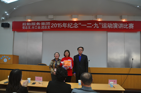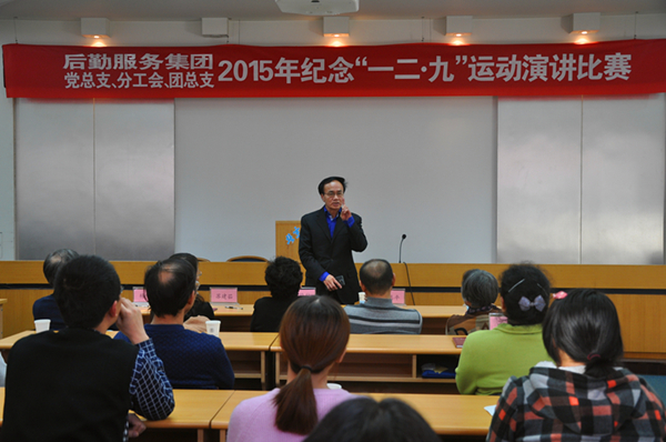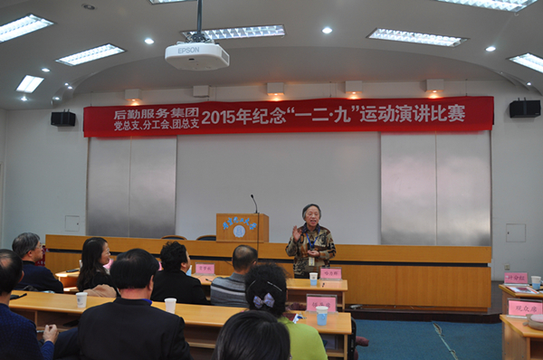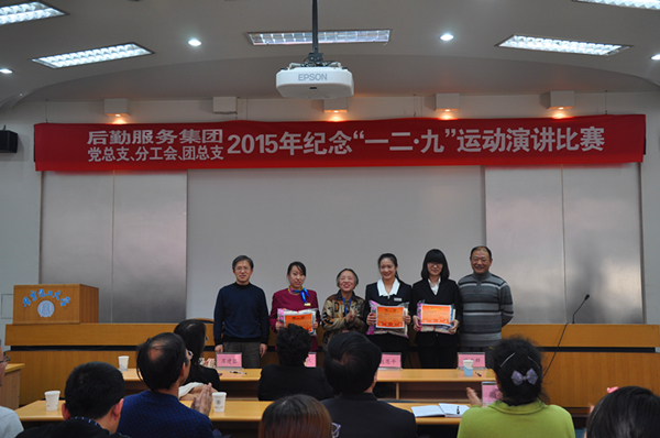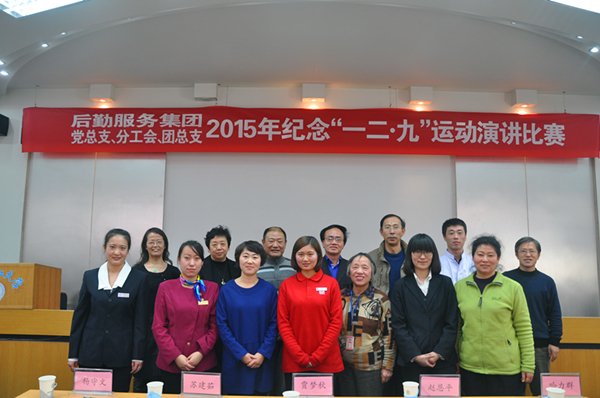2015年12月10日下午,后勤服务集团党总支、分工会、团总支举行2015年纪念“一二•九”运动演讲比赛。北京化工大学副校长王贵、后勤服务集团总经理赵恩平、党总支书记裴永昕、工会主席张燕华、副总经理王中秋出席了本次演讲比赛。本次活动也非常荣幸的邀请到校工会常务副主席贾梦秋、校服务中心主任苏建茹、校读书协会会长杨守文、文法学院老师哈力群作为本次比赛的评委。