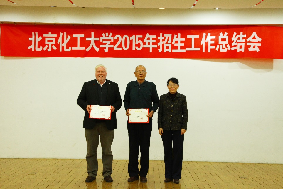 聘书颁发结束后,进入颁奖环节。与会校领导为2015年招生工作先进集体、先进个人颁奖。David G. Evans教授、魏寿彭教授在2015年度招生工作中表现尤为突出,所到的优质中学的录取人数均有成倍增长,荣获我校2015年度招生工作特殊贡献奖。退休教师招生宣讲团成员代表魏寿彭教授发言,他结合我校与社会实际,充分说明了学校成立退休教师招生宣讲团的重要性和必要性,在招生宣传过程中通过科普我校的顶尖前沿项目,吸引中学生了解我校的学科专业和人才培养特色。魏教授退而不休,一直奋战在我校招生宣传第一线的精神感染了在场的每一个人。