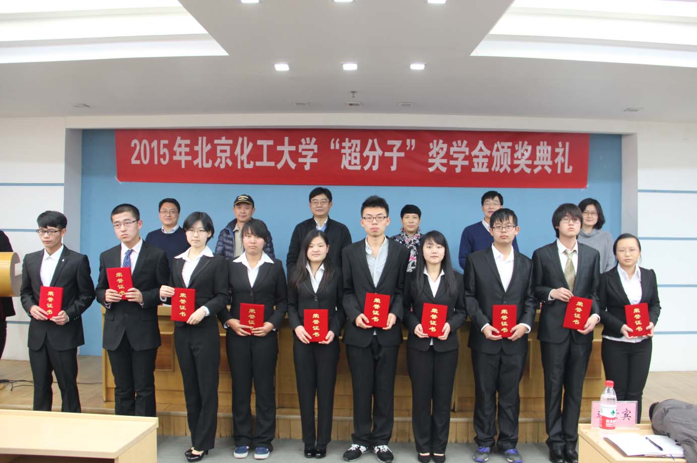 12月21日下午,2015年北京化工大学“超分子”奖学金颁奖典礼于逸夫会议中心中心会议室举行。校长助理宋来新、化工资源有效利用国家重点实验室主任何静、理学院党委书记李殿卿、理学院院长聂俊、学生工作办公室副主任付国柱、理学院副院长陈咏梅出席本次颁奖典礼。典礼由理学院分党委副书记郑秀英主持。