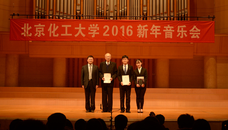 在音乐会现场,校党委书记王芳教授揭晓北京化工大学2015年“校长奖”获奖者名单,在2015年度招生咨询工作中做出突出贡献的魏寿彭教授、材料学院材博13班孙殿明同学和材料学院高材1209班徐薇同学荣获嘉奖。校长谭天伟院士为获奖者颁发荣誉证书和奖牌,获奖师生在象征永久铭记与勇往直前的手模板上留下印记。