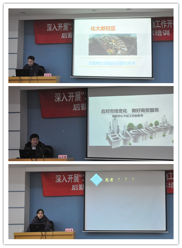 在工作交流环节,集团副总经理、餐饮中心主任王中秋作《后勤餐饮面临的问题和思考》报告,校医院院长宗力群作《校医院整体改革规划》报告,商贸中心主任刘云泉作《应对市场变化,做好商贸服务》报告,三位主任分别交流了各中心当前的状况,面临的形势以及今后开展工作的思路。