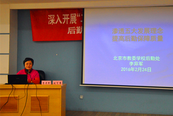 本次培训邀请了北京市教委后勤处副处长李异军作《渗透五大发展理念,提高后勤保障质量》报告。李处长详细介绍了当前后勤工作的形势背景和重点任务、后勤管理模式的变化、后勤标准化建设三个大方面内容,指出必须深刻认识宏观发展形势对高校后勤工作的影响和要求,明确多重背景下的重点工作任务,加强制度建设,推进后勤标准化工作,着眼未来,积极建立和打造与现代大学制度相适应的新型后勤保障体系。