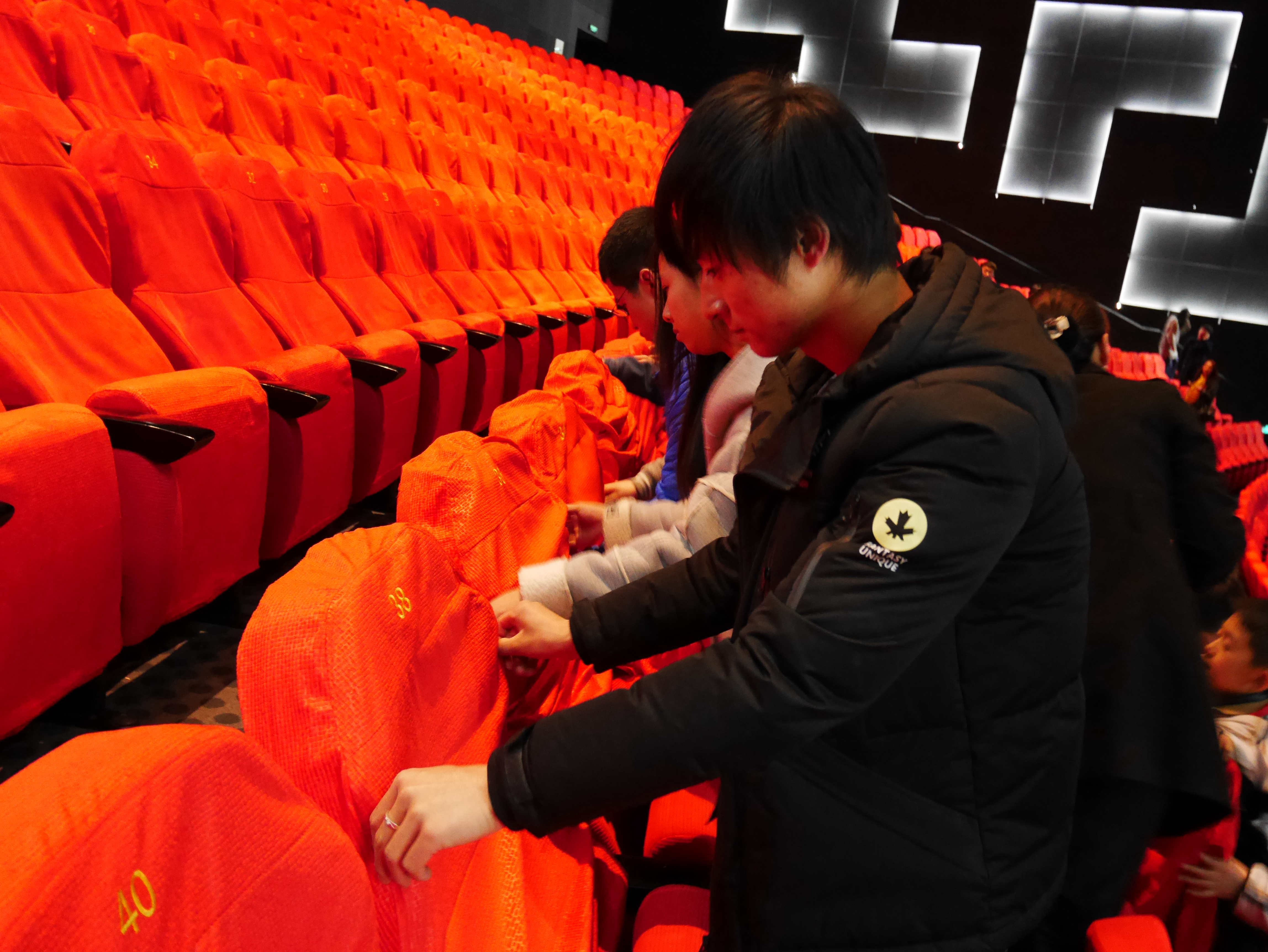 大小志愿者齐心协力,为影院部分座椅更换椅套