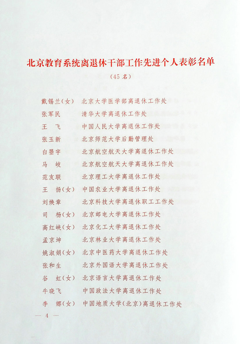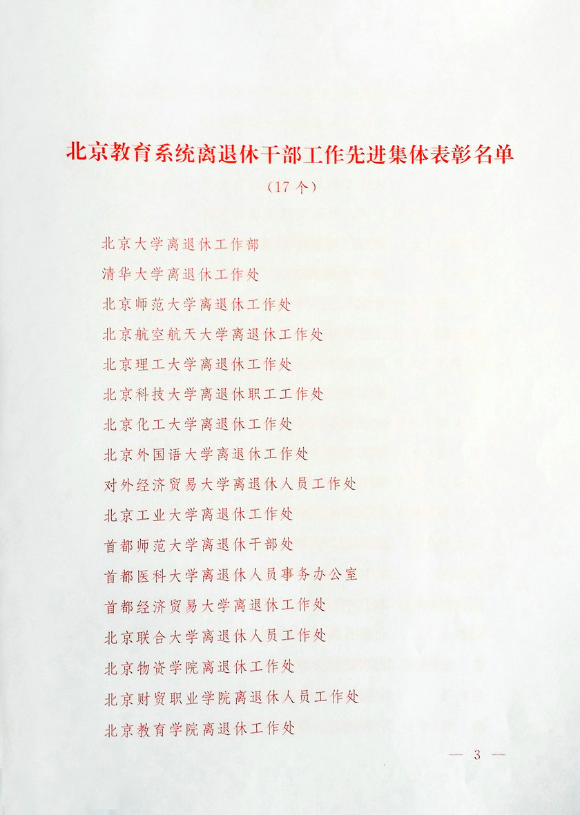 3月16日下午,北京市委教育工委在中国地质大学国际会议中心召开北京教育系统离退休干部工作会议。市委教育工委常务副书记张雪,市委教育工委委员、北京教育系统老干部工作领导小组副组长陈江华,市教委委员张永凯出席会议,北京各高校离退休干部工作主管校领导和部门负责人参会。我校党委副书记兼纪委书记关昌峰,离退休人员工作处处长、党总支书记高红峡参加了会议。大会表彰了17所高校离退休干部工作部门和45名离退休干部工作者。我校离退休人员工作处荣获“北京教育系统离退休干部工作先进集体”荣誉称号,离退休人员工作处处长高红峡同志荣获“北京教育系统离退休干部工作先进个人”荣誉称号。