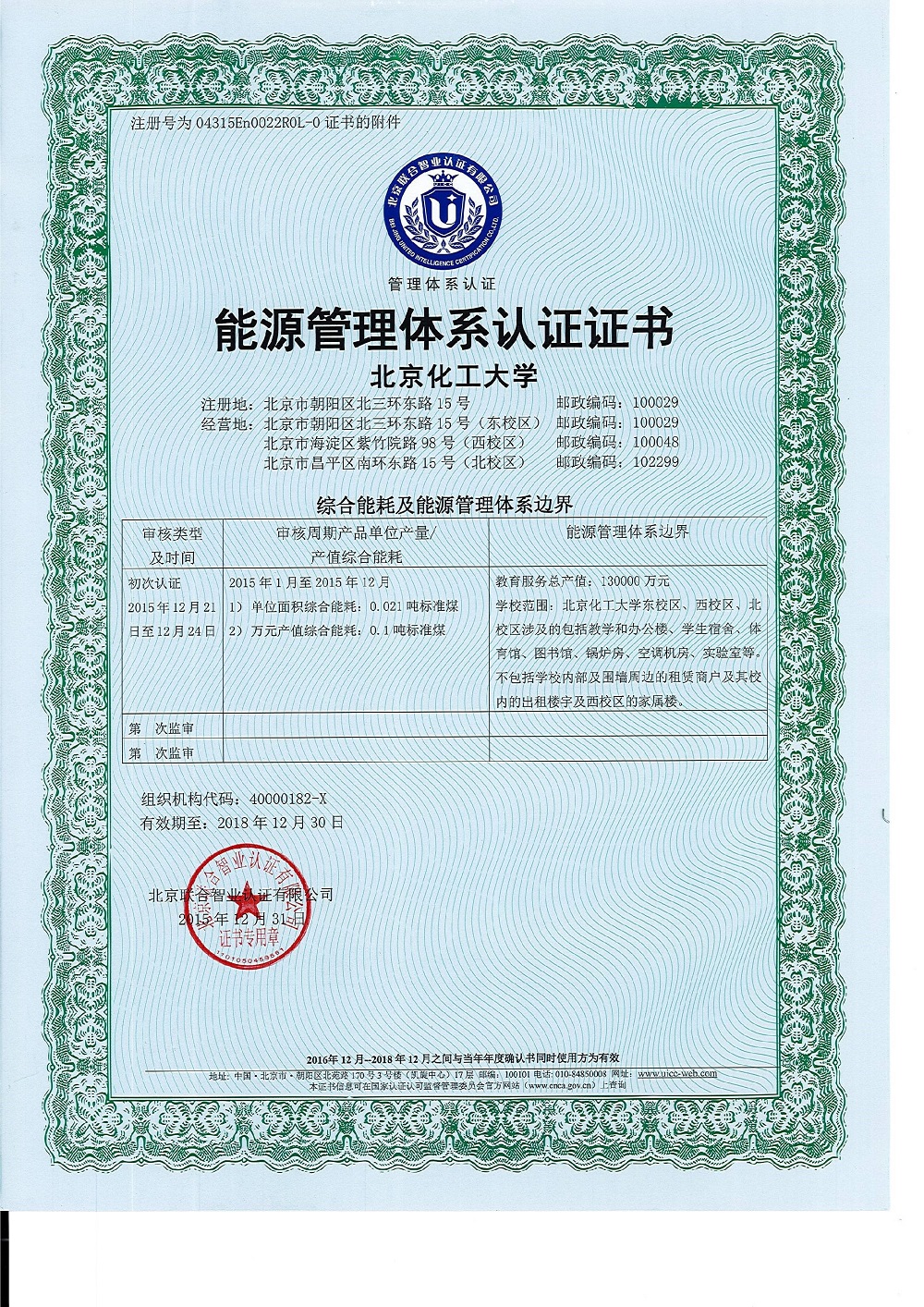 为促进首都生态文明建设,落实国家“十二五”节能减排任务,根据北京市发改委、市质监局、市财政局三部门联合发布的《关于推进在京万家企业和市级考核重点用能单位能源管理体系和碳排放管理体系建设工作的通知》要求,市发改委、市质监局组织专家于2015年11月来我校进行建设效果评价审核。近日,接到有关单位通知,我校顺利通过能源管理体系认证,并取得国家认监委发布的证书(见下图)。