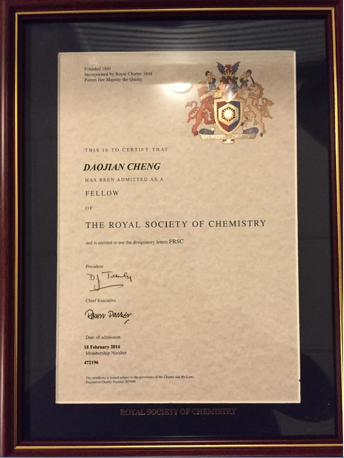 近日,我校化学工程学院程道建教授接到英国皇家化学会通知,被选为英国皇家化学会会士(Fellow of the Royal Society of Chemistry, FRSC)。