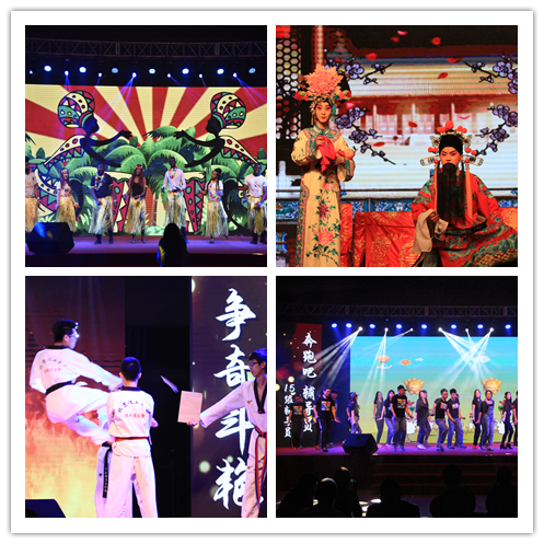 随后,各社团为师生们呈现了不同凡响的节目。TNT搞笑社的相声《做人要厚道》让全场笑声不断;跆拳道协会的《火花》和散打协会的《武动乾坤》展示出了武术之魂;国粹社的京剧选段《坐宫》与汉服社的汉舞《芙蓉池》演绎出了东方古典神韵;国际交流协会的《We’re all together》舞出了留学生的奔放**;DID街舞社的《Overdoes》、心理协会的情景剧《南来北往》、金达莱韩语社的舞蹈《起舞的金达莱》、BYL beatbox协会的人声合唱、红十字协会的手语歌《默》和魔族魔术社的《Fool us》更是异彩纷呈,赢得观众的阵阵掌声;最后,15级辅导员带来的《奔跑吧,辅导员》节目则将现场气氛推向**,现场掌声欢呼声此起彼伏。