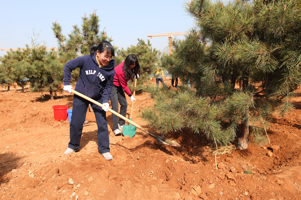 大家挥锹铲土、一丝不苟按照要求为树苗培土、修建树耳、浇水。这是校领导和中层干部第二次在新校区义务种树,本次共种植了403棵景观树——油松。
