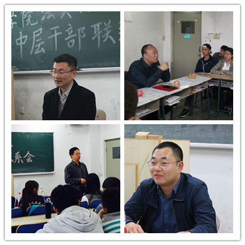 在中层干部联系人与班级“师生面对面”座谈会的基础,文法学院建立了中层干部联系班级工作群,并实行联系班班长每月向中层干部联系人邮件汇报班级情况制度,以及中层干部参加班级读书会制度,通过具体的举措大力推进中层干部兼任班级联系人制度常态化、实效化。